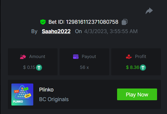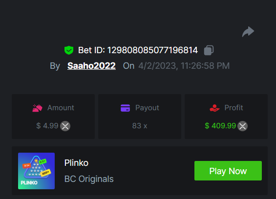 1. EASY link Classic dice 5x https://bc.game/#/sd/117EOWX3F1K1SJ Baccarat 9x https://bc.game/#/sd/117EOZ6USZT7O3 Crash 10x https://bc.game/#/sd/117EP2U6S409AR Egyptian Adventure 10x https://bc.game/#/sd/117EP9B9T7VJ83 Medium Roulette 36x https://bc.game/#/sd/117ENZMSFO2DXV Plinko 76x https://bc.game/#/sd/117EMVH8REZPJN Keno 50x https://bc.game/#/sd/117EMYPFS2740J natural BJ https://bc.game/#/sd/117ENUFTP6WAAB Hard Wheel 49.50x https://bc.game/#/sd/117EPFD06SU9EB Screenshots EASY MEDIUM HARD