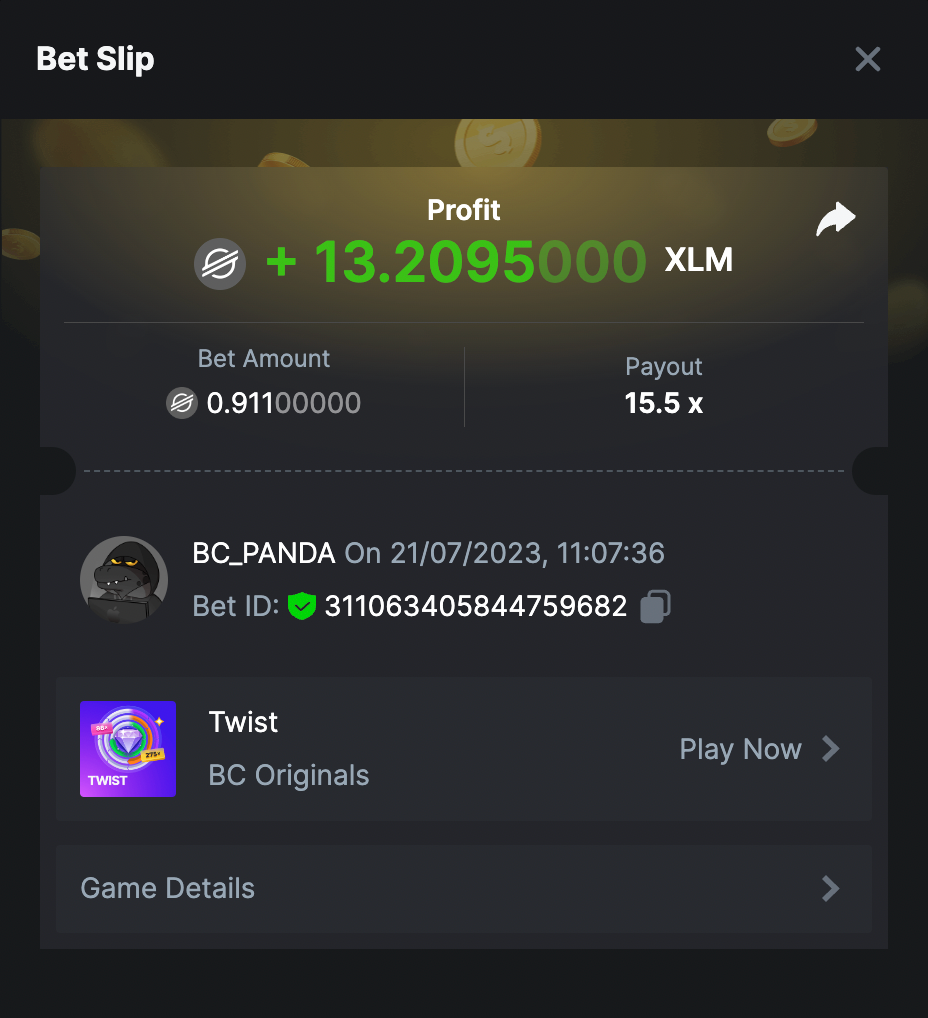 21. $5k Prestige TWIST Challenge #98 DURATION: 21st JULY - 28th JULY 12:30 pm UTC Welcome, esteemed VIPs! Get ready to experience the thrilling roller coaster of our brand new release game called "Twist"! Embrace the excitement as you navigate through twists and turns to claim magnificent rewards from our $5,000 prize pool. Stick to the challenge's terms and conditions, and you could be one of the lucky winners. So, fasten your seatbelts, and let's unveil the rules for this exciting competition, leading you towards the prestigious first prize! What's the Challenge? Capture a multiplier - 9.0x or higher on the TWIST Game. Make sure you get your multiplier captured on my bets section. The highest multiplier will be considered. If a tie occurs in the multiplier, the next ranking player with the higher average bet amount (in USD) being the 2nd winner and so on. If there is a tie in the amount and multiplier, the one who posted or edited his post first will be considered in the Ranking. How to Enter To enter, copy the link of the bet you'd like to submit. Once you've copied it, paste it as a reply to this thread like so: Link: https://bc.game/#/sd/11EAIVFO99PS9Z In the same post, upload a screenshot of your win by clicking the game ID WITH VIEW IN USD mode ENABLED (accessible at the bottom of dropdown menu for your wallet up top. This way, we can ensure that your bet indeed met the minimum requirement at the time of placing it: Link: https://bc.game/#/sd/11EAIVFO99PS9Z Minimum VIP Minimum VIP 4 with phone verified will be eligible! Minimum Payouts Minimum payout to qualify is 9x Minimum Bet Size $0.15 USD equivalent Eligible Coins All cryptocurrencies are eligible (excepting JB) Available Prizes GENERAL TERMS Please combine all of your hits together in a SINGLE post. Edit your existing post for additional hits, don't create a new post. Each eligible entry must have the Bet Slip URL, failure to include it will disqualify participation in the event. Bet Slip image is not mandatory. Bets must be posted within 24 hours of placing bet in order to keep things fair for everyone. Bets must be made during the specified time window stated above. This thread will lock automatically when the time period is over. One (1) entry per household. Anyone found attempting to win multiple prizes will be disqualified from this challenge as well as all future challenges. Failure to follow instructions will result in your submission being null and void. By entering this challenge, you acknowledge that BC.Game has the final decision on results and placement. Payouts will be distributed after the event is finished. Please note that it could take anywhere between 24 hours to 7 days after the completion of the event.