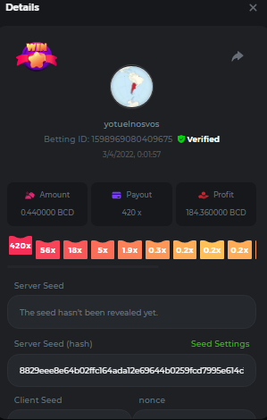 |11 x| 13x | 22x | 29x | 33x | 43x | 58x | 76x | 88x | 110x | 120x | 170x | 260x | 420x | 620x | 1000x | 11x https://bc.game/#/sd/10WXQJHAC93AQB 13x https://bc.game/#/sd/10WZ9S36YV4P3N