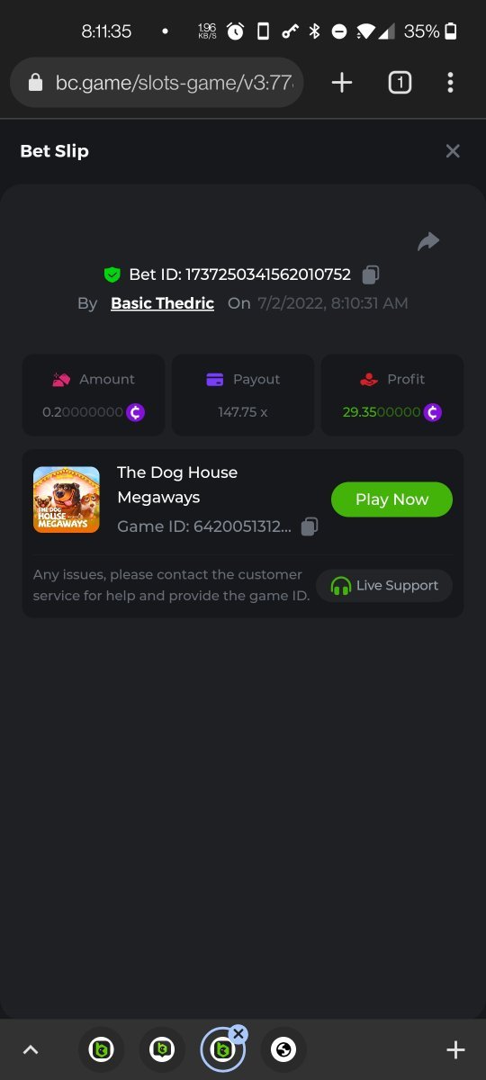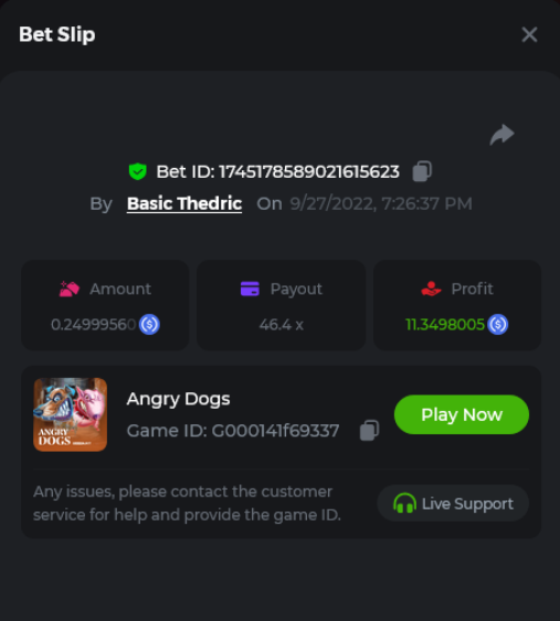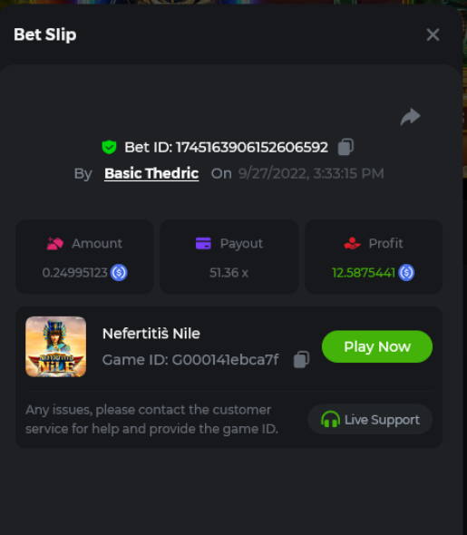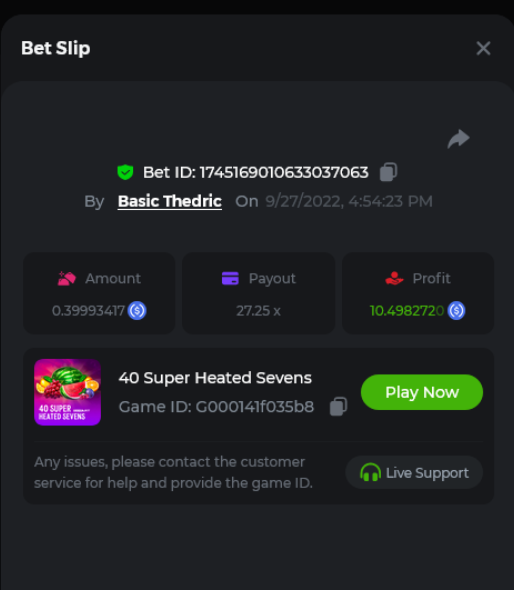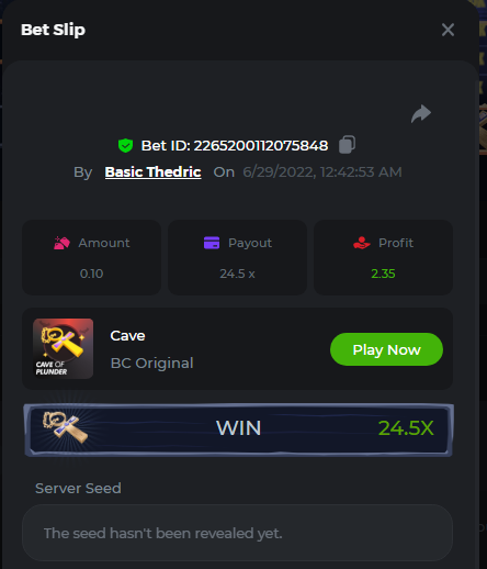 Multiplier: 100X Bet: $0.4096 Bounty: Yes Glad this didn't take too long. I'm not a fan of this game. IMO the bounty is silly for this one. Too easy. As can be seen by how many ppl on page 1 alone got it. Just my $.02 https://bc.game/sd/?sd=10TEPGQMJ45HCJ And the bounty https://bc.game/sd/?sd=10TEOAK0JLFOCZ -
