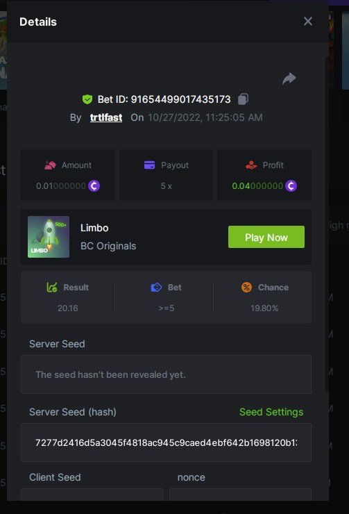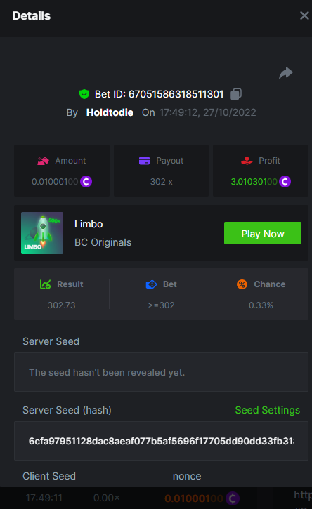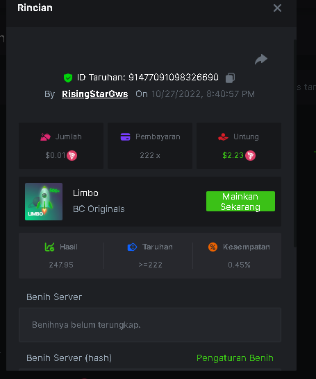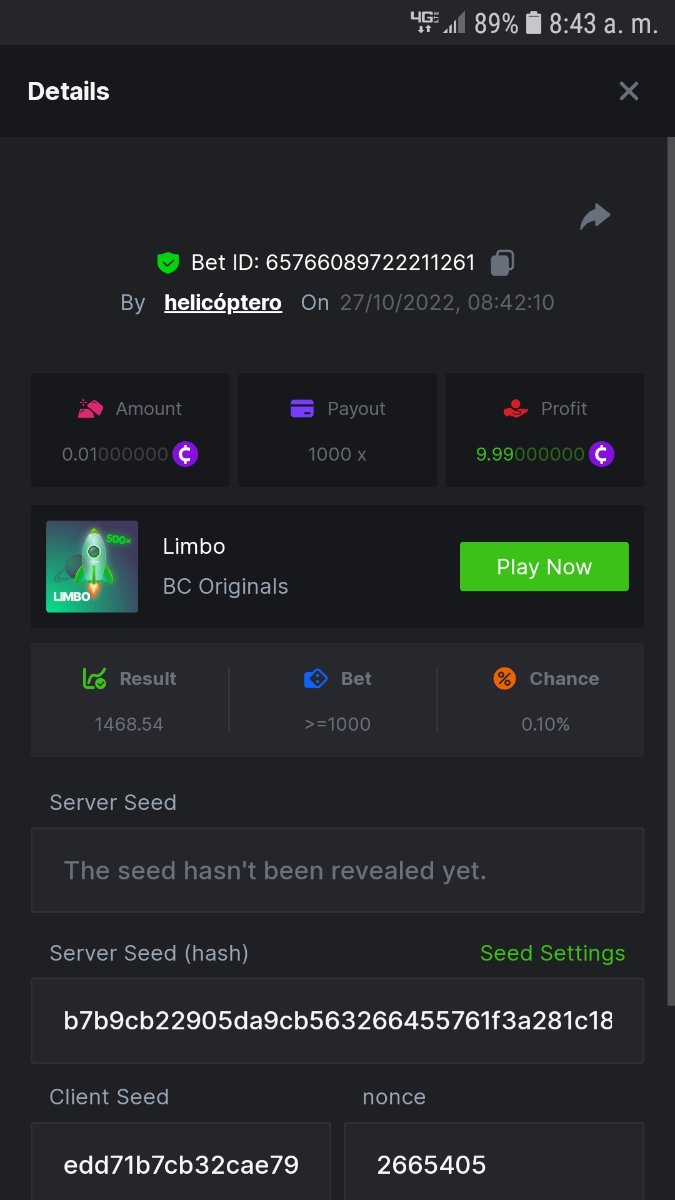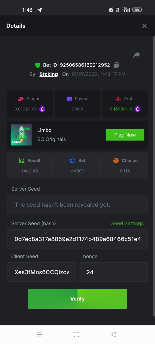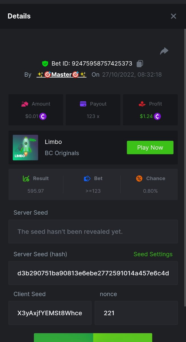 Black Tiger Posted October 27, 2022 Share Posted October 27, 2022 (edited) Read Carefully Before Start To Hunt Daily Challenges #51: LIMBOHunt :Win the highest pay outMin Payout requirement 100xMin Level 4️Duration Starting : Now End time : 23.59 UTC Time How to Join?Make screenshot + paste your bet link + UID or Profile link Mini bet amount - 0.01$ Any coin allowedReward Prizes 1st Place....... $7 BCD2nd Place..... $5 BCD3rd Place...... $4 BCD 🎖4th Place......$3 BCD5th - 10th Place......$1 BCD 🏵 Winners will be announcing next day after Roll Point Edited October 27, 2022 by vinrek 1 Link to comment Share on other sites More sharing options...