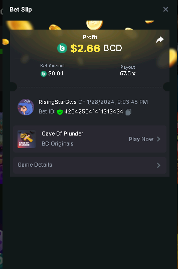 Moderator Giandreas Posted January 28, 2024 Moderator Share Posted January 28, 2024 Read Carefully Before Start To Hunt Forum Daily Challenges #493Hunt : Cave of Plunder Win the highest pay out Min Payout : x17 Min Level 10 ️Duration Starting : Now End time : 23.59 UTC Time How to Join? Make screenshot + paste your bet link + UID or Profile link Any coin, with min bet 0.01 USD is allowed (jb/bb/bcl not allowed) Reward Prizes 1st Place.....$7 BCD 2nd Place.....$5 BCD 3rd Place.....$4 BCD 4th Place.....$3 BCD 5th Place.....$2 BCD 🏵 Winners will be announcing next day after Roll Point! Link to comment Share on other sites More sharing options...
