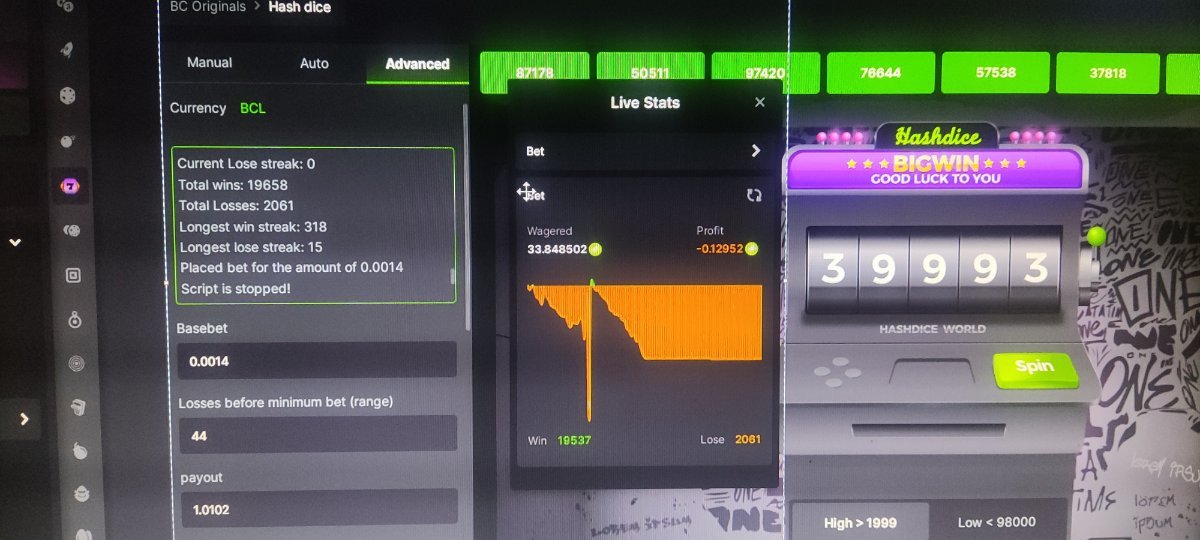 Thanks for your reply and explanation. I run the script for 20.000+ bets with minimum base bet, it seems fine until the first big drawdown and recovery... But after that, I think something went wrong.... Apparently, after a big series of losses, the script stabilized at the minimum bet, never increasing again. Here is the graph: