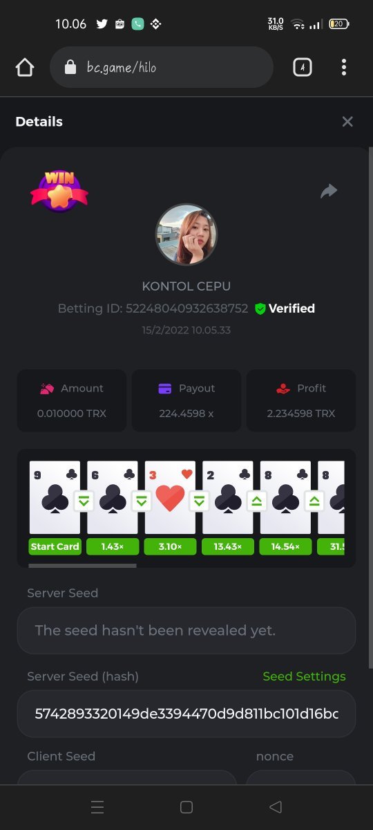 Wiro212sableng Posted February 14, 2022 Share Posted February 14, 2022 King Hilo weekly challenge Periode 11-18 Februari2022 Challenge dengan mencari total Raihan poin tertinggi di game Hilo Peraturan permainan: - Koin bebas selain JB coin Sistem point: Payout 100x atau lebih : 10 point Payout 200x atau lebih : 20 point Payout 300x atau lebih : 30 point Payout 400x atau lebih : 40 point Dan seterusnya payout kelipatan 100 di hitung 1 dan akan dikalikan 10 point. Misal : payout 1455x : 14 x 10 point : 140 point Post username kalian dengan reply post di bawah Post screenshot betid kalian di sini, dan edit post untuk memasukan screenshot bet id selanjutnya User level 3 ke atas no multi account Koin bebas selain bj koin Khusus user Indonesia Post screenshot betidnya di forum Bet berlaku mulai tgl 15 Februari 2022 jam 06.05 am dan max post 24 jam dari semenjak bet di buat. Challenge berakhir Jumat, 18 Februari pukul 19.00 pm Hadiah: 1. 12 bcd shitlink 2. 8 bcd shitlink 3. 5 bcd shitlink 4-10. @2 bcd shitlink 10-15 @1 bcd shitlink Keputusan juri tidak dapat di ganggu gugat Link to comment Share on other sites More sharing options...